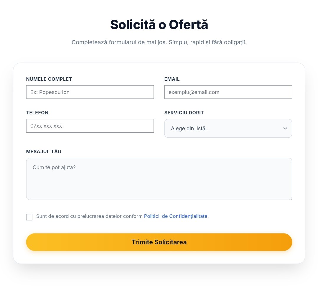 Contactează-ne pentru o ofertă personalizată. Suntem aici să te ajutăm cu cele mai bune soluții pentru nevoile tale.